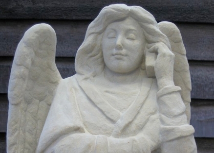 The Little Angel, slouching slightly, in blue jeans and with a laptop bag over her shoulder, has a cellphone pressed against her ear and the look my 14-year-old daughter haswhen she’s listening intently to a friend and shouldn’t be disturbed. The body language and downward glance suggest, This is an important call.
