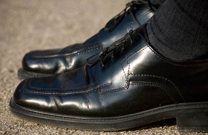 Dutifully I scanned the shoe rack. Not much to choose from. But on the bottom row sat a pair of black leather shoes. I picked them up and turned them over. Not a scuff or scratch, the bottoms were clean and shiny. They looked brand-new. Size 12, no less. The answer to my prayer!
